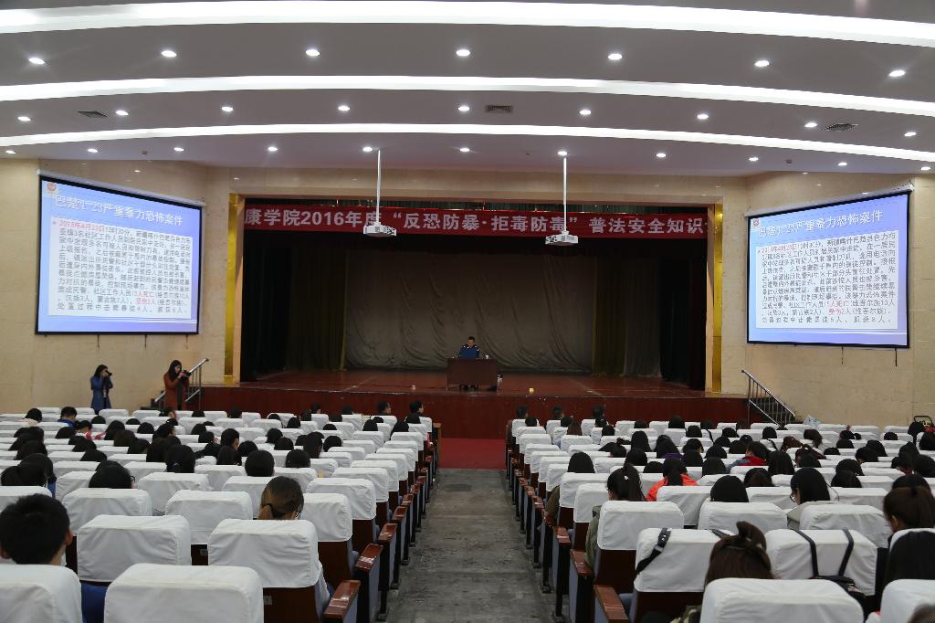 2016年11月8日下午4:20分,由学校宣传部、学工部、团委、保卫处共同组织的“反恐防暴·拒毒防毒”普法安全知识讲座在江南校区大礼堂厅举行。讲座由安康市公安局禁毒支队副支队长邝勇和反恐支队民警贺习全主讲,江南校区六个二级学院720余名学生参加。安康市公安局经文保支队民警刘祥松、学校党委宣传部部长鲁延安、保卫处处长张文华、团委副书记肖红香、政社学院老师李朴、教育学院老师赵斌等出席了讲座。