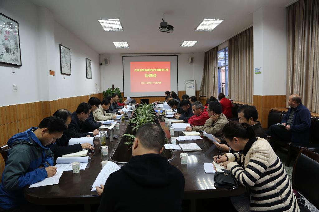 11月8日下午,安康学院在江南校区第一会议室召开了安康市创建省级文明城市工作协调会。党委副书记、学校创文工作领导小组组长胡鸿晓主持会议并讲话,党政办、组织部、宣传部、学工部、团委、工会、教务处、人事处、计财处、保卫处、后勤保障处、江北校区管委会办公室、信息中心等职能部门负责人及12个二级学院党总支书记参加了会议。