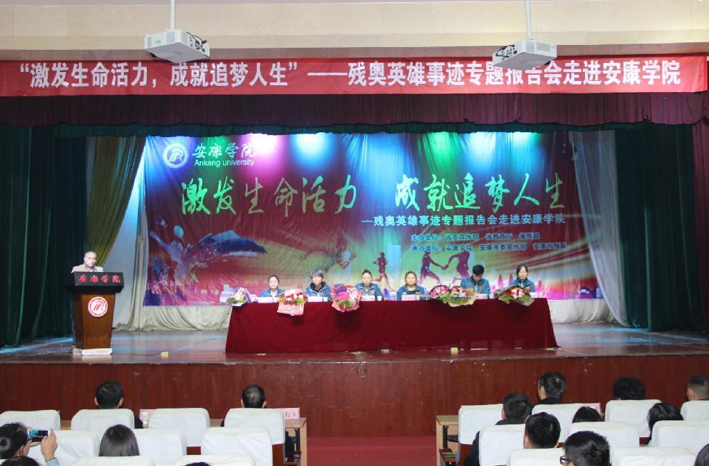 由省委宣传部、省教育厅、省残联主办,安康学院、安康市委宣传部、安康市残联承办的“激发生命活力,成就追梦人生――残奥英雄事迹专题报告会”于11月17日在安康学院大礼堂隆重举行。省残联党组成员、副理事长王占军,省残联宣文部主任邵华,安康学院副校长杨行玉,市残联党组书记、理事长王太芳,市残联党组成员、副理事长鲁宝国,市、区残联代表及我校600多名学生代表参加了本次报告会。