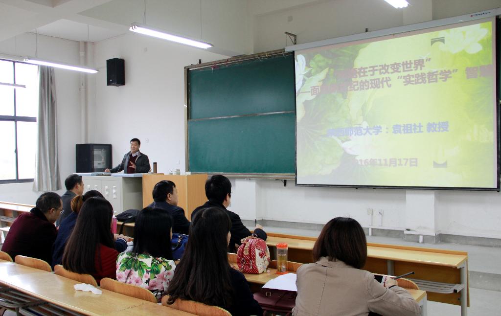 11月17日,陕西师范大学袁祖社教授受邀莅临我校,为政治与社会发展学院学生做了一场《问题在于改变世界——面向新世纪的现代“实践哲学”智慧》的专题讲座。