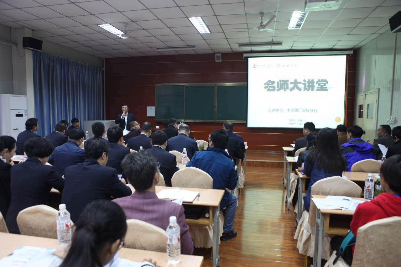 11月17日上午,由安康学院与中国银行安康分行联合举办的《名师大讲堂》第四期学术讲座在我校江南校区1018教室举行。本期讲座特邀中国银行首席经济学家曹远征博士主讲《宏观经济形势与政策展望》。我校师生代表、中国银行安康分行员工代表及特邀嘉宾100余人聆听了讲座。