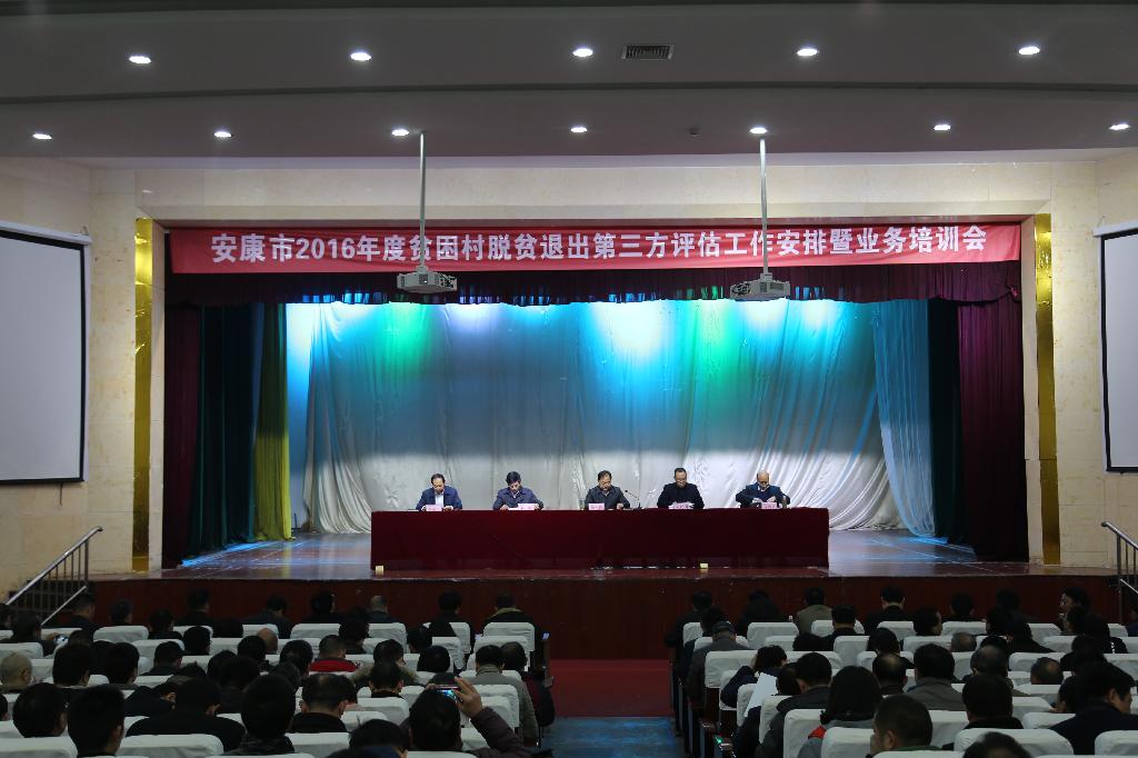 根据安康学院与安康市扶贫局签订的安康市2016年贫困村脱贫退出第三方评估工作协议内容,安康学院全面启动了安康市2016年脱贫攻坚第三方评估工作。12月2日,安康市2016年贫困村脱贫退出第三方评估工作安排暨业务培训会在我校大礼堂举行。安康市委副书记鲍永能、安康市副市长何邦军、安康学院校长陈刚、安康学院副校长向纪明、安康市政府副秘书长刘福全、安康市扶贫局局长陈扬斌出席会议,各县区分管领导、扶贫局长,参与第三方评估的我校专家、市人大代表、市政协委员、扶贫系统干部、第一书记、驻村干部约230人参加了会议。会议分别由安康市政府副秘书长刘福全、安康市扶贫局局长陈扬斌主持。