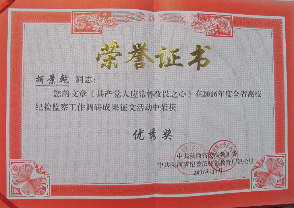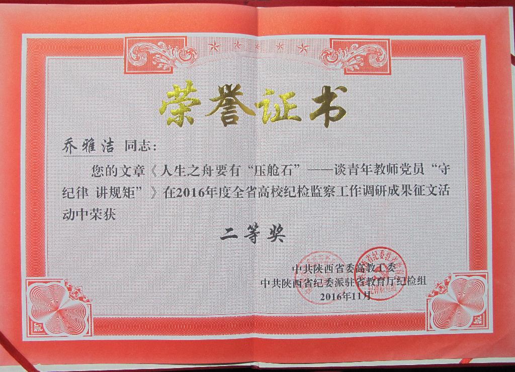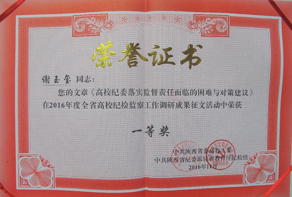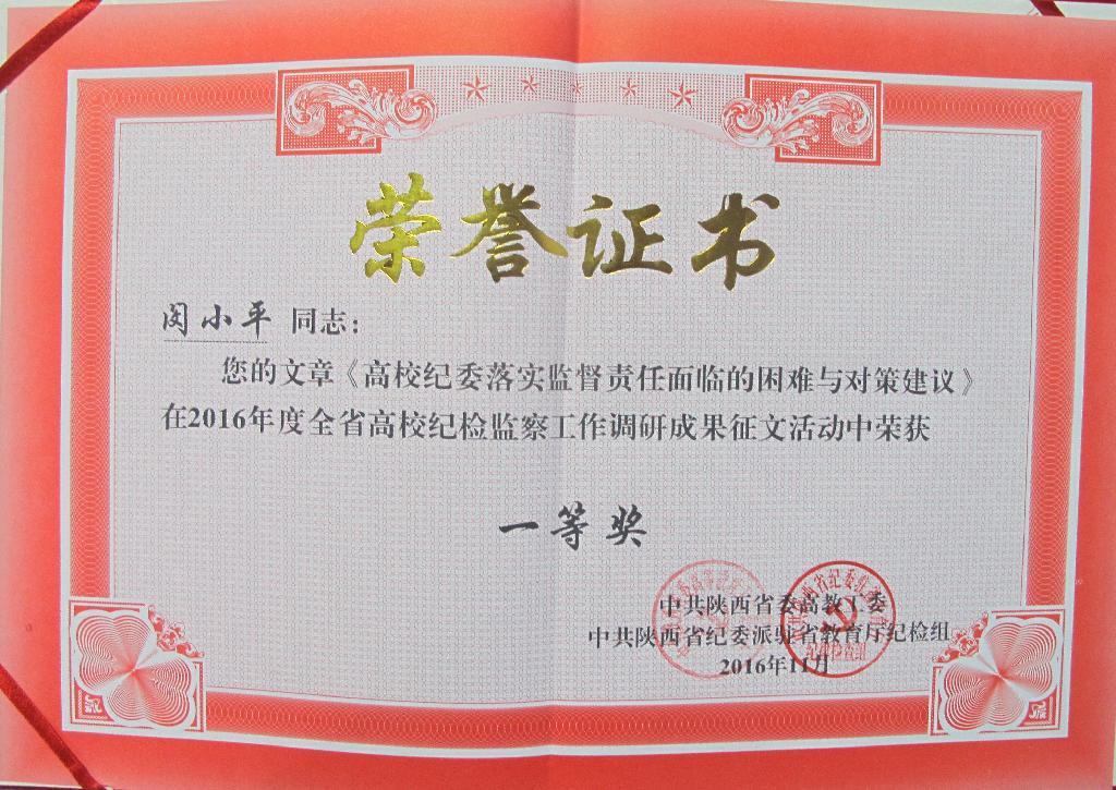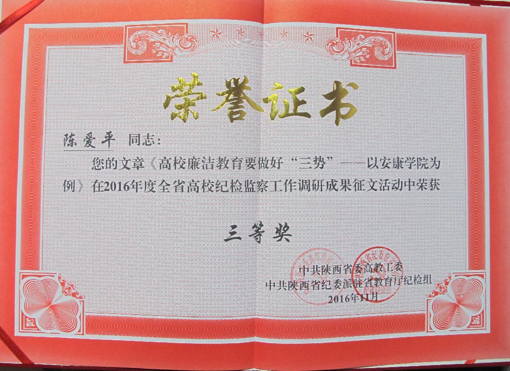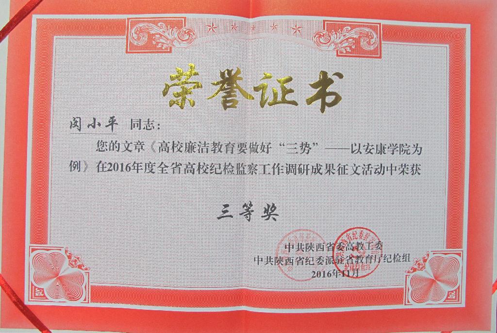 会上,中共陕西省委高教工委、省纪委驻省教育厅纪检组宣读了《关于2016年度全省高校纪检监察工作调研成果及学习心得征文评奖结果的通报》,我校多位老师的研究成果及心得文章获奖。其中,闵小平、谢玉玺撰写的文章《高校纪委落实监督责任面临的困难与对策建议》荣获一等奖,经济与管理学院党总支纪检委员乔雅洁老师撰写的文章《人生之舟要有“压舱石”——谈青年教师党员“守纪律 讲规矩”》荣获二等奖,闵小平、陈爱平撰写的文章《高校廉洁教育要做好“三势”——以安康学院为例》荣获三等奖,直属机关三党支部胡景乾研究员撰写的文章《共产党人应常怀敬畏之心》荣获优秀奖。