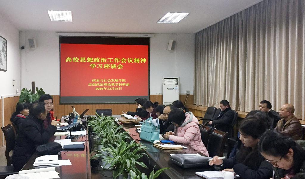 为了贯彻“全国高校思想政治工作会议”精神,发挥思想政治理论课主渠道作用,2016年12月21日下午,思政部召开全体教师认真学习习近平总书记在全国高校思想政治工作会议上的讲话精神并开展座谈交流。