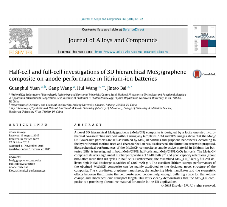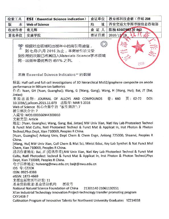 根据教育部科技查新工作站的检索证明,我校化学化工学院教师袁光辉以第一作者发表的论文《Half-cell and full-cell investigations of 3D hierarchical MoS2/graphene composite on anode performance in lithium-ion batteries》被Essential Science Indicators(ESI)归入材料科学领域同一出版年最优秀的前1%之列。这是我校迄今为止第一篇进入ESI的科技论文,也标志着我校材料科学研究水平达到了一个新的高度。