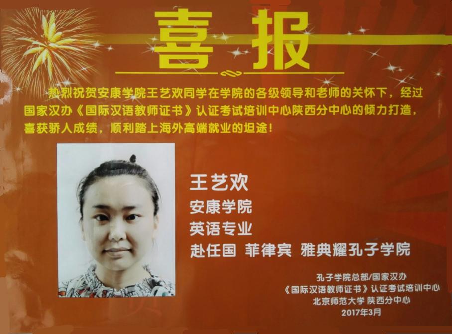 近日,我校从国家汉办陕西分中心获悉,外语学院英语专业2013级学生王艺欢经国家汉办北京师范大学培训中心培训,以优异成绩通过层层选拔,即将赴菲律宾孔子学院担任海外志愿汉语教师。