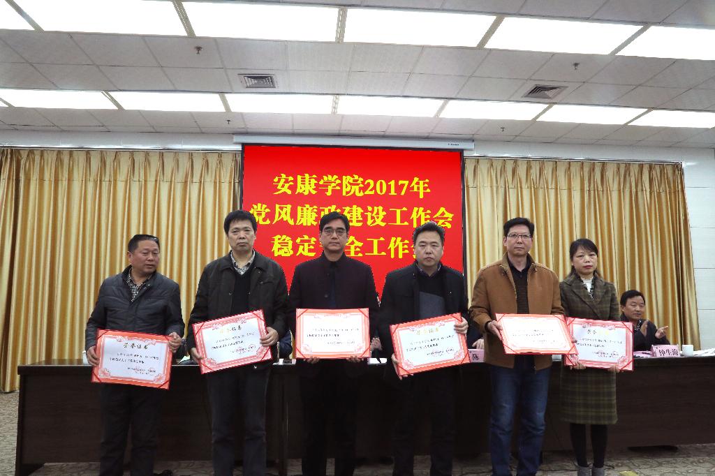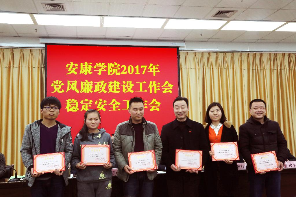 副校长向纪明宣读了《中共安康学院委员会关于表彰2016年学校稳定安全工作先进集体、先进个人的决定》;化学化工学院党总支书记谢军、后勤保障处处长高立平代表稳定安全工作先进集体,文传学院辅导员沈菲代表先进个人做了交流发言;会上,还对获得表彰的先进集体和个人举行了颁奖仪式。