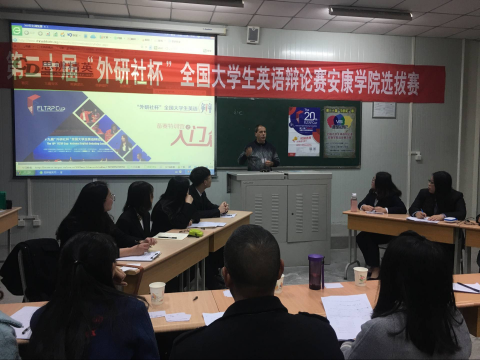 近日,由安康学院教务处、共青团安康学院委员会主办,安康学院外语学院承办的第二十届“外研社杯”全国大学生英语辩论赛安康学院选拔赛决赛在江南校区10号教学楼1026教室隆重举行。我校教务处副处长张纪生、团委副书记李光梓、外语学院副院长李继平、张哲华作为特邀嘉宾观看了本次辩论赛。外语学院教师刘子富、姜国波、马剑瑛、梁艺凡和外教Frank担任本次比赛评委。