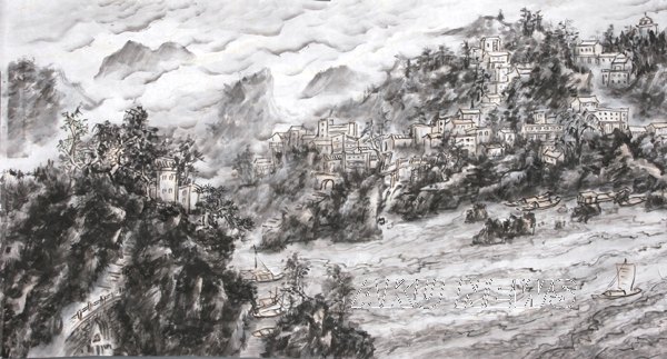 我院艺术系副主任章长青,自2002年始,从汉中的潘冢山到湖北汉口,沿江写生,不畏艰辛,感悟造化,录其所见,搜集素材。面对苍茫大江和沿岸起伏的群山峻岭,速写千帧,择其精要,悉心布局,在羽伯的合作下,累三年创作出近年来少见的百米长卷《汉江千里图》。