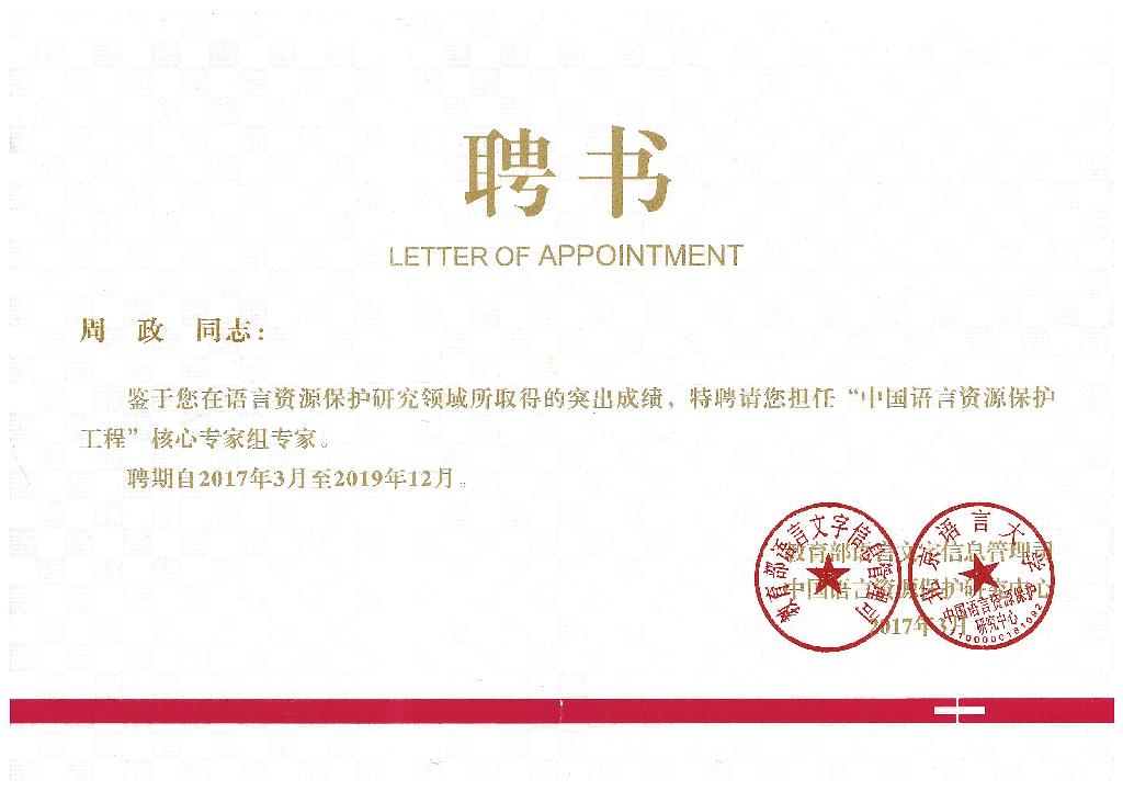 会上,我校文学与传媒学院周政教授作为唯一一位地方院校与会成员被教育部语言文字信息管理司、北京语言大学中国语言资源保护研究中心聘为“中国语言资源保护工程核心专家组”专家。