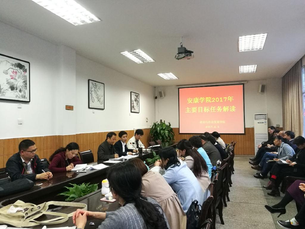 4月5日下午,政社学院在江南校区第一会议室召开了安康学院2017年主要目标任务解读会,校长陈刚参加了会议,会议由政社学院党总支书记冯丰收主持。