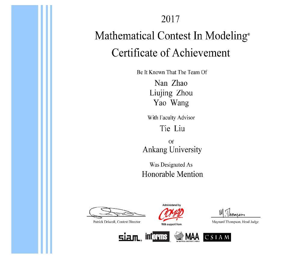 4月8日,2017年美国(国际)大学生数学建模竞赛(MCM/ICM)成绩揭晓,安康学院参赛队首次参赛并取得斩获二等奖(Honorable Mention奖)的佳绩。