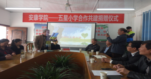 为进一步落实我校服务地方基础教育的办学定位,加强高校与小学的合作发展,4月7日下午,安康学院——五星小学合作共建捐赠仪式在汉滨区五星小学隆重举行。我校教务处处长余谦、教育学院院长黄路阳,五星小学教务主任马兆海、总务主任党刚代表双方学校参加了仪式。陕西教育报刊社副社长吕志军,汉滨区政协副主席周裕厚,安康市老科协常务副会长李剑涛及数位老科协成员,教育学院教师、合作推进人李支其,安康学院外聘教师邹服生等参加了捐赠仪式。