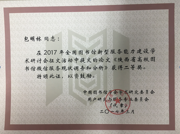 2017年4月5日至8日,“2017年全国图书馆新型服务能力建设学术研讨会”在沈阳师范大学召开。我校图书馆包明林老师提交的论文《陕西省高校图书馆微信服务现状调查与分析》获得二等奖。