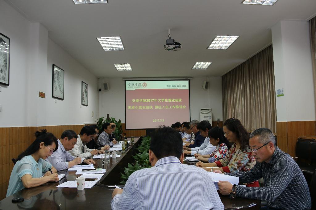5月2日下午,在江南校区第一会议室召开了“安康学院2017届毕业生就业创业工作推进会”,安排部署2017届毕业生就业、家庭经济困难生就业帮扶、创新创业平台建设与创业孵化项目遴选、2017年大学生兵役登记与应征入伍等专项工作。学校党委副书记、纪委书记闵小平,副校长钟生海,学工部、招生就业处负责人,各二级学院党总支书记参加了会议。会议由副校长钟生海主持。