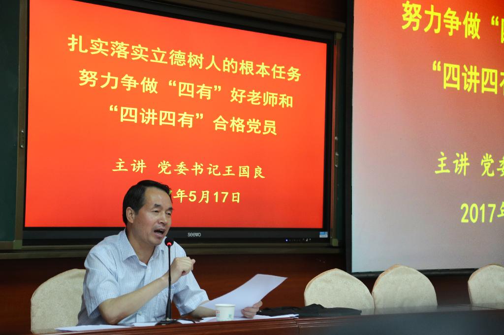 面对新形势,如何做一位具有使命担当的、合格的、深受学生喜爱的“四有”好教师和“四讲四有”合格党员?王国良对全体党员提出了殷切的希望和要求:一要牢固树立教育新理念。坚持立德树人,以育人为核心,引导学生正确处理人与自身、人与社会、人与自然的关系,因材施教,顺天致性,培养既能守正、又能创新的优秀人才。二要了解未来教育的发展趋势。要培养具有世界眼光和竞争力的中国人才,为中国的崛起而努力,教师要从传统的传授者和灌输者的角色,转变为教学活动的组织者和引导者。三要进行教学改革的尝试。科学修订人才培养方案,进一步优化课程体系与教学内容,更新教学内容,改革教学方法和教学手段,积极尝试探究式学习、案例教学、高峰体验课程等。四要为实现两大战略任务而努力。大力推进人才培养模式改革,不断加强优势特色专业、学科建设,加强“双师型”师资队伍建设,积极开展国际合作交流,拓宽校企、校地合作的深广度。五要切实做好教书育人、管理育人、服务育人工作。要坚持把立德树人作为中心环节,坚持“四个统一”,把思想政治工作贯穿教育教学全过程,实现全程育人、全方位育人,全体教师要带头坚持“学术研究无禁区、三尺讲台有纪律”原则,站好课堂讲坛,当好学生的方向引路人和人生导师。