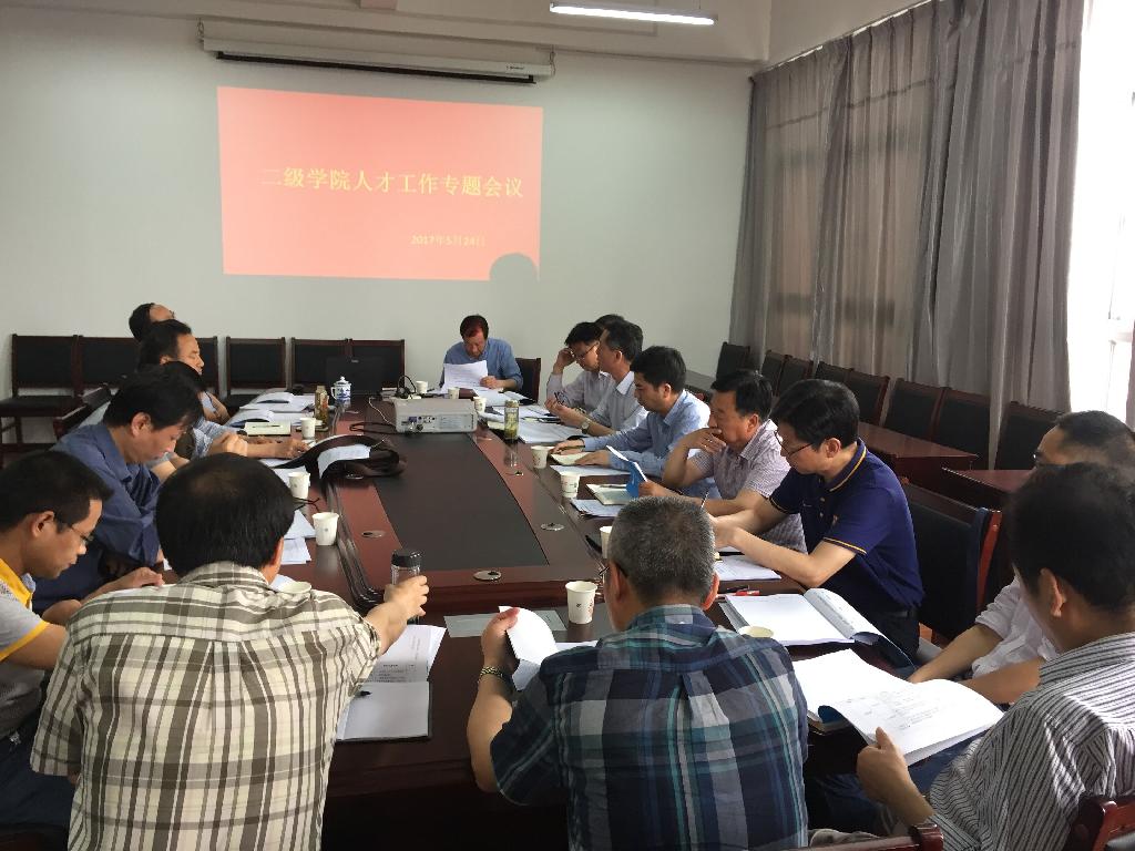 为深入贯彻陕西省委高教工委、陕西省教育厅关于深化人才发展体制机制改革会议精神和“追赶超越”工作部署,我校于5月24日下午在陕南民间文化研究中心会议室召开二级学院人才工作专题会议,校长陈刚、人事处、教务处、科研处负责人、二级学院院长参加了会议。会议由陈刚主持。