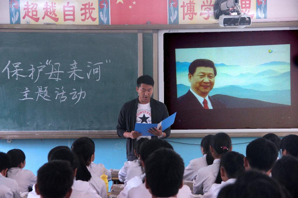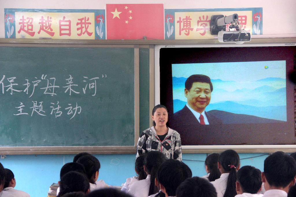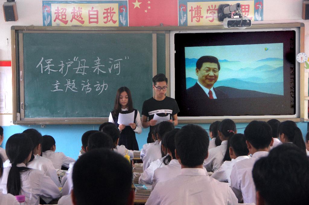 在仓上中学八(4)班的教室里,与会师生首先共同观看了人民日报推出微视频《习近平瞩望绿水青山》;视频中,习近平总书记与所有普通百姓一样,期望蓝天、白云、洁净的水和新鲜的空气。无论走到哪里,他都心系生态环境保护;在陕西,他强调要尽可能减少对自然环境的损害。在他看来,绿水青山就是金山银山,保护环境就是保护生产力;“要像保护眼睛一样保护生态环境,像对待生命一样对待生态环境”;“绿水青山就是金山银山”的朴素道理,正得到越来越多人们的认同。