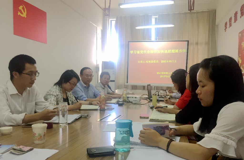 为深入学习贯彻落实中国共产党陕西省第十三次代表大会精神,继续深化“两学一做”学习教育,落实省委《打造高教强省、助力追赶超越》的目标要求,推进我院教育教学内涵式发展,6月7日,我校副校长杨行玉同志深入旅环学院,组织召开专题学习会,为旅环学院全体党员作“学习省党代会精神,加快追赶超越步伐”的党课辅导报告,交流学习贯彻中国共产党陕西省第十三次代表大会精神,落实“追赶超越”和“五个扎实”的体会和思考。我院全体党员同志参加了会议学习了党课讲授。