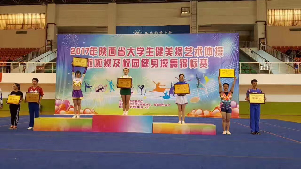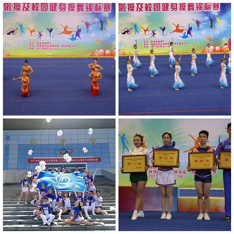 2017年陕西省大学生健美操、艺术体操、啦啦操及校园健身操舞锦标赛于6月4—6日在西安邮电大学举行,来自全省45个高校近1000名运动员参加了比赛。其中,健美操比赛分甲(普通本科)、乙(体育院校)、丙(高职高专)三个组,共设25个项目。乙组共有包括西安体育学院、陕西师范大学、长安大学、西安电子科技大学、西安工业大学、西安建筑科技大学、陕西理工大学、宝鸡文理学院等9个院校13支参赛队伍,我校代表队参加了乙组比赛。