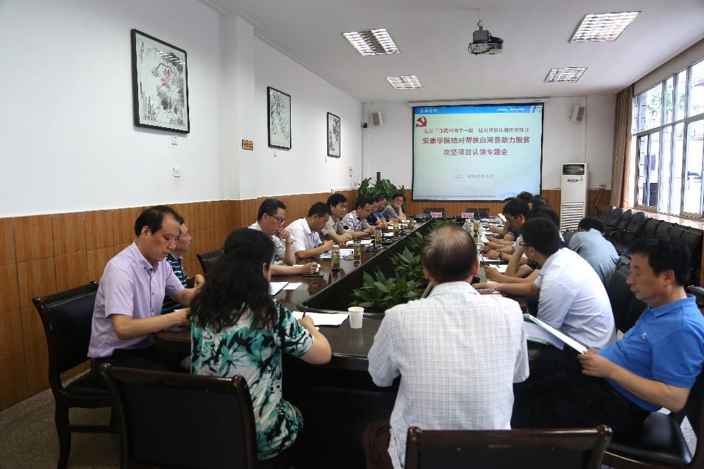 为扎实推进"两学一做"学习教育常态化制度化,将"两学一做"学习教育与脱贫攻坚工作有机结合起来,学校党委坚决贯彻省委省政府关于普通高校结对帮扶贫困县的会议精神,迅速落实学校结对帮扶白河县助力脱贫攻坚行动计划实施方案和各项工作部署,把学习教育的成果转化为推进脱贫攻坚的强大动力,安康学院于2017年6月8日在我校江南校区第一会议室,组织开展了党员干部“践行两学一做 认领扶贫项目”助力白河脱贫攻坚项目认领会。学校扶贫工作领导小组副组长、党委副书记、纪委书记闵小平,第一批扶贫项目落实单位负责人,学校扶贫工作专家团队队长、副队长,结对帮扶工作队队员参加项目认领会。会议由党委委员、组织部部长屈险峰主持。