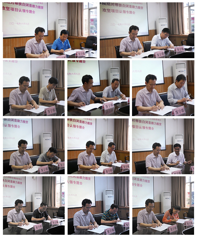 闵小平与第一批22个扶贫项目的落实单位负责人逐一签订了项目认领书,并对下一阶段助力脱贫攻坚项目实施提出具体要求:一要理清思路,优化队伍,产业带动,注重实效;二要在项目实施中力争做到扶贫攻坚与“两学一做”相结合,点与面相结合、长期与短期相结合、服务与研究相结合,达到合作共赢;三要以“抓铁留印,踏铁留痕”的精神,扎实开展工作;四要加强协调,充分沟通,切实解决扶贫工作中遇到的困难和问题。