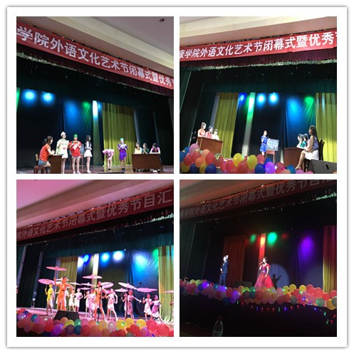 外语文化艺术节闭幕式以影视社团自制的微电影《盛开吧,青春》拉开帷幕,开场少儿拉丁舞《花样年华》带领观众领略了从古典到现代变化多姿的舞蹈风格;疯狂口语社团优秀选手张丹的《魅力外语学院——The Charm of School of Foreign Language Studies》演讲,结合影像方式,向在场师生介绍了独具特色的外语学院魅力;英文歌曲大赛获奖学生李乐、杨家玉将非洲手鼓与经典曲目《Lemon Tree》巧妙结合,表演清新自然;由艺术学院张慧老师和外语学院蒋京京同学合唱的《You Raise Me Up》让大家在憧憬梦想的同时,领略到了美声与通俗唱法合璧的音乐魅力;英语教学情景剧《遇见夏天》,题材新颖,寓意深刻,演绎丝丝入扣,让观众耳目一新,感慨万千;外语学院青年教师王庚的一曲韩语歌曲《If You》更将晚会推上高潮;由英语专业学生自编自导的英文版《孔雀东南飞》话剧将中西文化有机结合;最后晚会在歌曲《Can't Take My Eyes Off You》中完美落幕。
