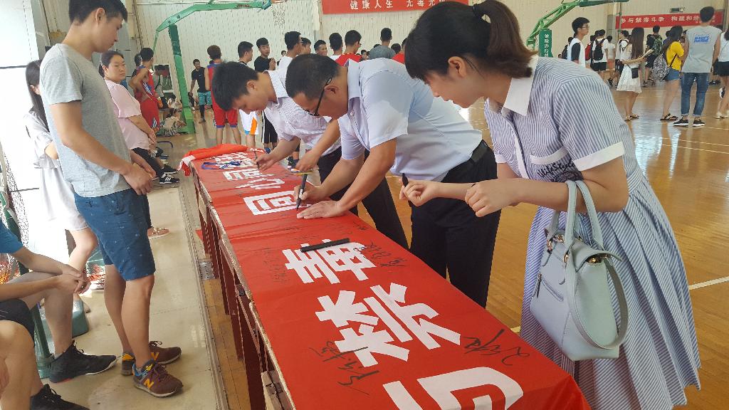 我校数统学院2016级数学与应用数学1班李泽代表全体运动员宣誓;广大师生、我校护校队及禁毒宣传专项社会实践团队,积极响应“珍爱生命,远离毒品”的号召,在禁毒宣传横幅上签名,用实际行动表达了珍惜生命,拒绝诱惑,抵制毒品的决心,教育学生养成良好的生活习惯,培养积极健康的心态。