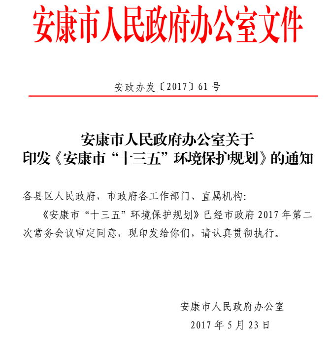 经安康市人民政府2017年5月23日第二次常务会议审定,发布关于印发《安康市“十三五”环保规划》的通知,2017年06月13日公开发布该规划。