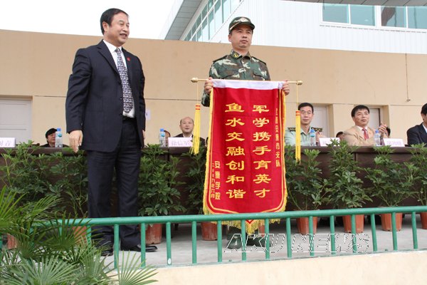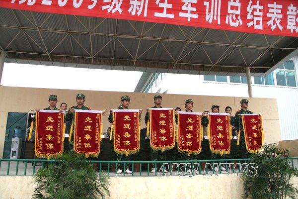 王兴林院长代表学院向武警安康支队赠送锦旗表示感谢。学工部部长郑树青宣读了军训中涌现出来的先进集体和个人的表彰决定。学院领导和部队首长为军训先进集体和个人颁发了锦旗和证书。