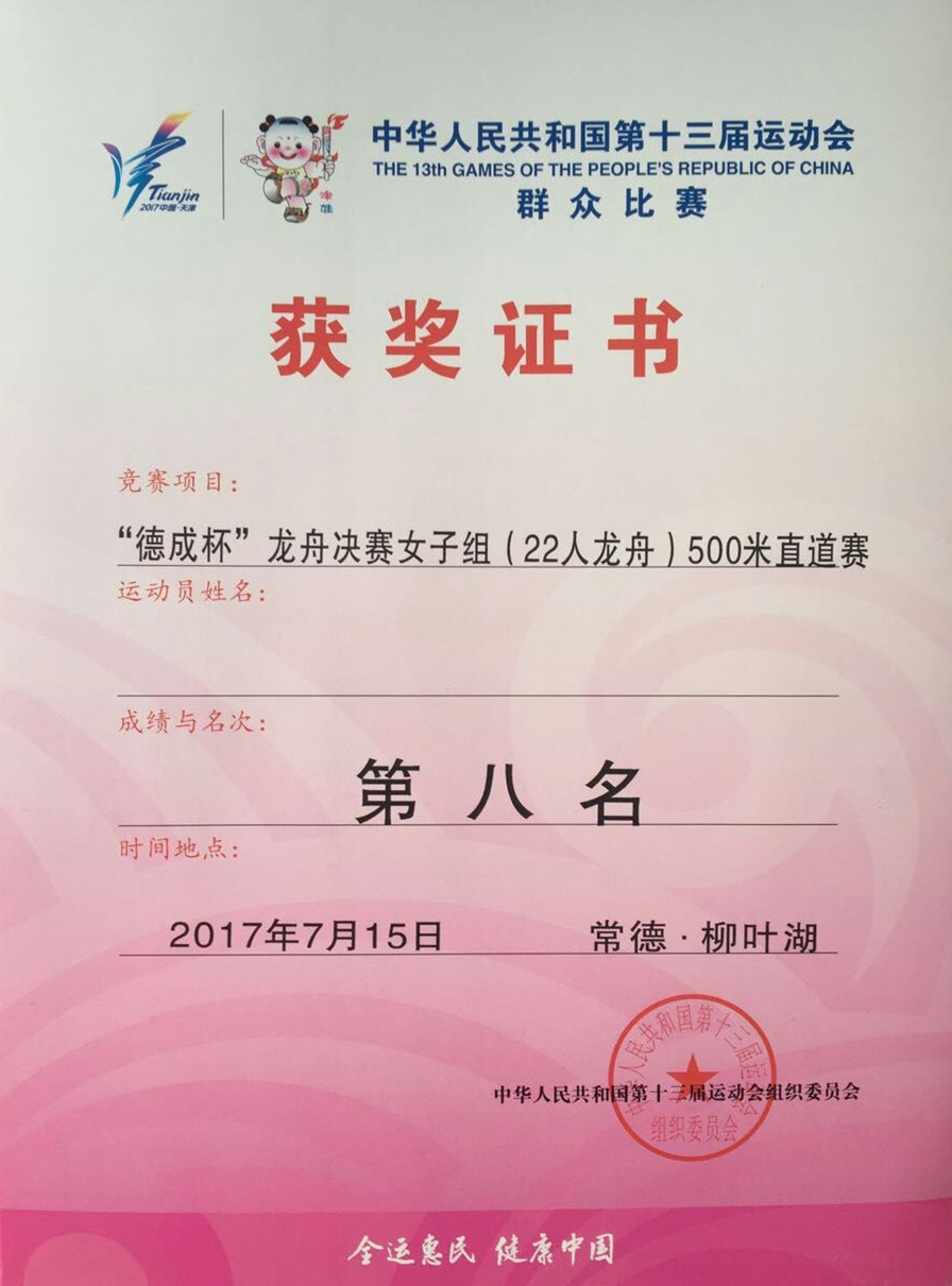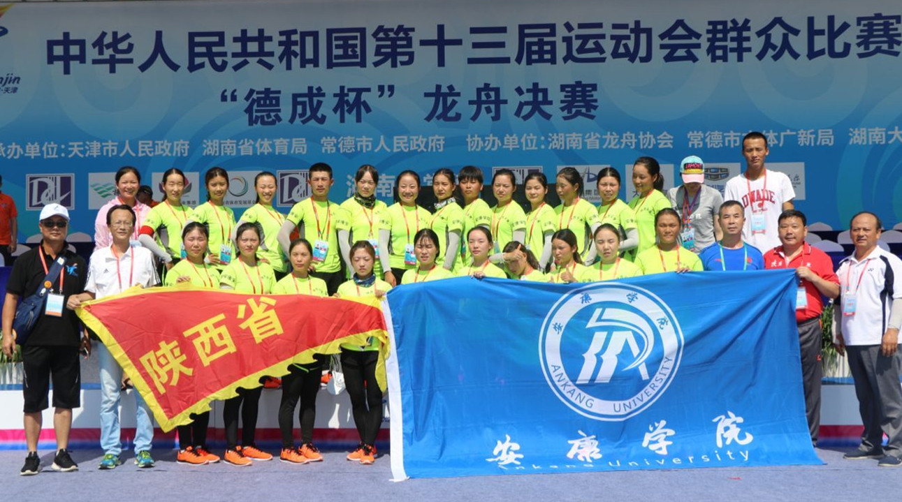 在正式组建龙舟队参加第十三届全运会群众比赛之前,陕西竞技标准龙舟尚属空白,为了参加十三运备战十四运,陕西省体育局经考察后,把组建龙舟队的任务交给了水域资源较丰富的安康,安康市政府、安康市体育局则把这一重任交付给了安康学院。来自我校的60余名学生进行了刻苦集训,最终58名队员分别组成男、女两支队伍参加预赛。我校出动教师、后勤等专业力量对运动队进行全方位保障。在预赛中,我校女子龙舟队在缺少一名桨手、船身无法保持平衡状态的不利条件下,奋力拼搏,递补进全运会决赛。站上决赛赛场,对于我校女子龙舟队而言,本身已经是一场胜利。这支临时组建、毫无经验的学生军,承担起了代表陕西征战第十三届全运会群众比赛龙舟项目的重任。决赛中,我校女子龙舟队表现出了她们自己也难以置信的坚韧,取得了比训练时更理想的成绩。