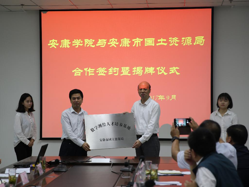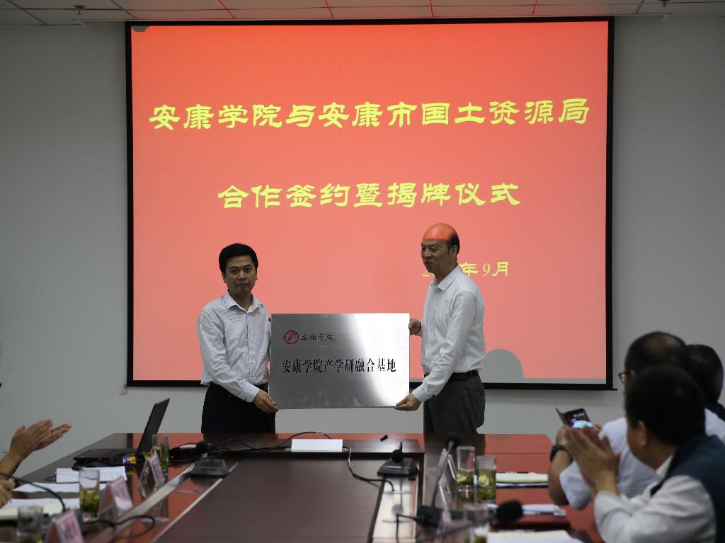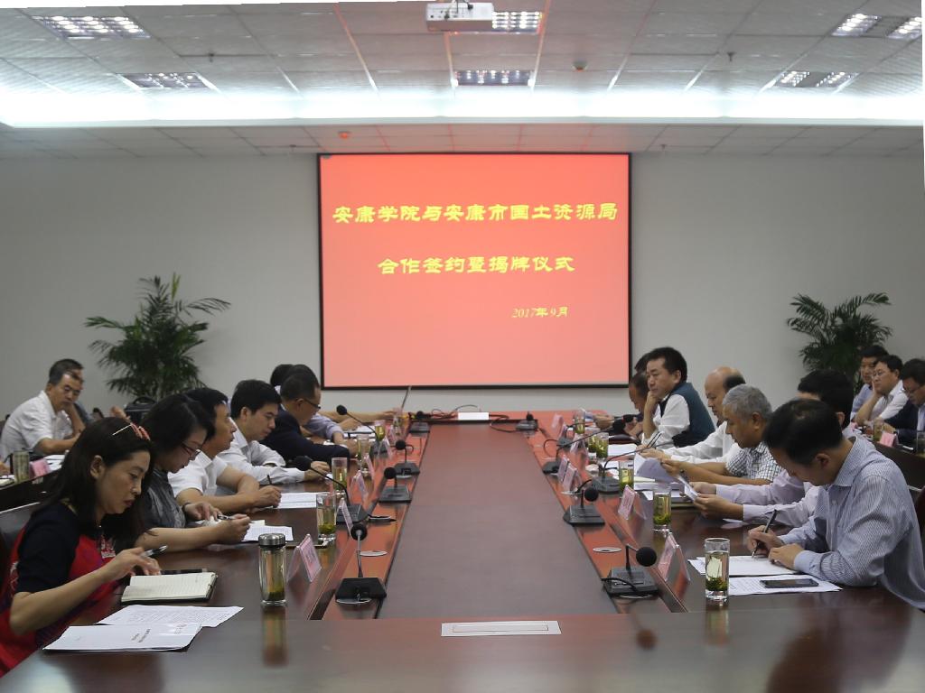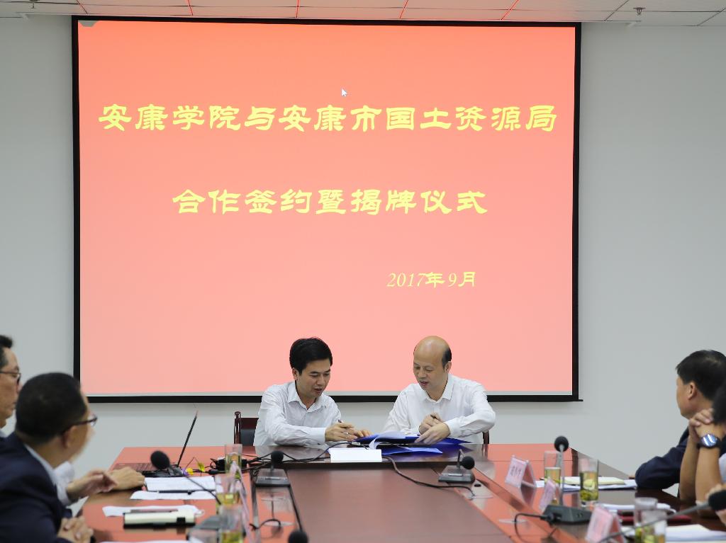 9月6日上午,安康学院与安康市国土资源局产学研合作签约暨揭牌仪式在江北校区逸夫科技楼九楼会议室举行。市国土资源局局长廖坤波,副局长王福祥、黄自新,市地质灾害防治办公室主任华军,市土地统征中心副主任成小平、市土地整理中心主任党晓龙及市移民搬迁办综合科科长刘年喜等各科室负责人一行17人出席签约暨揭牌仪式。我校校长陈刚、副校长向纪明,相关职能部门负责人及师生代表参加了本次签约仪式。签约仪式由向纪明主持。