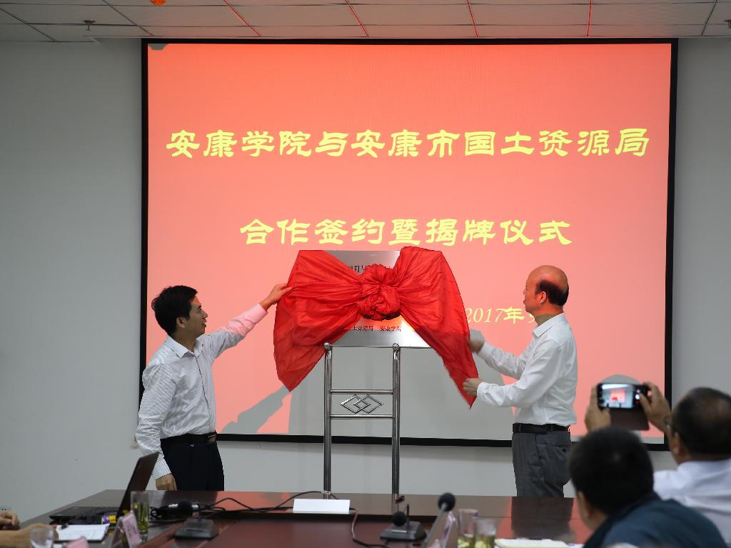 陈刚与廖坤波共同签署产学研合作协议,并为校地共建“秦巴国土资源利用与环境保护协同创新中心”揭牌;陈刚代表安康学院为安康市国土资源局授予“产学研融合基地”牌匾,廖坤波代表安康市国土资源局为安康学院授予“安康市数字测绘人才培训基地”牌匾。