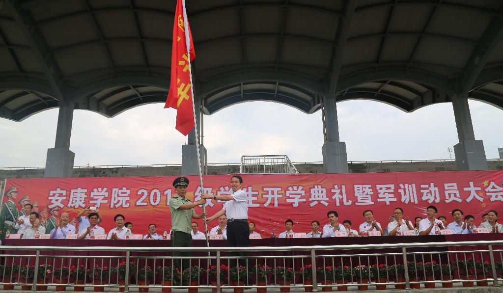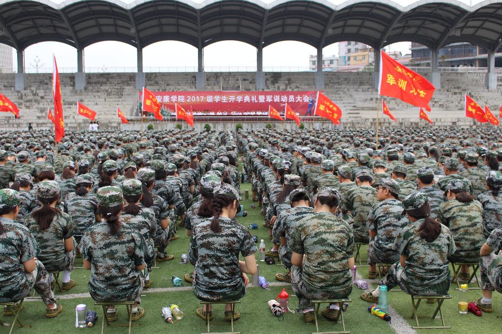9月8日上午,秋风徐徐、丹桂飘香,我校2017级学生开学典礼暨军训动员大会在江北校区体育场隆重举行。学校领导王国良、陈刚、闵小平、胡波、杨行玉、向纪明、钟生海、张东红,各二级学院院长、党总支书记、相关职能部门负责人及武警陕西某部教导员王浩少校等出席大会并在主席台就坐。近2600名英姿飒爽的新生与承训部队教官齐聚体育场,以庄严的开学典礼和为期两周的紧张军训,开启人生的崭新一页。