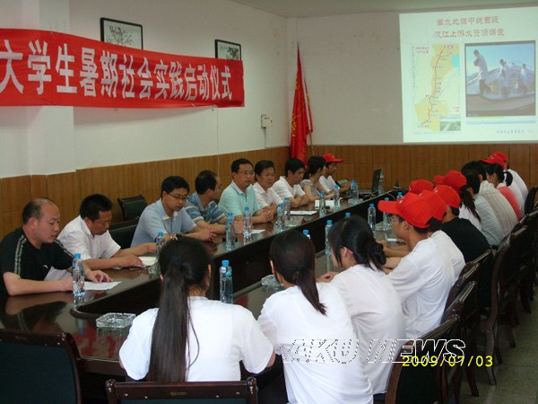 7月3日下午,学院团委2009年暑期大学生社会实践活动招标项目―― “南水北调西段水源地――汉江中上游水资源状况调查”启动仪式在第一会议室举行。学院副院长向纪明和宣传部、团委、保卫处负责人以及承担此项任务的化学化工系指导教师和学生出席了本次活动。启动仪式由化学化工系党总支书记张立虎主持。