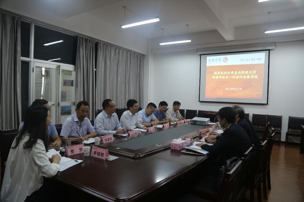 9月12日,台湾嘉南药理大学校长陈铭田、校务研究中心执行长杨胜凯、董事长助理黄清贤一行3人来我校访问考察,并就加强合作交流、促进两校发展等,与我校领导、相关院系和职能部门负责人展开座谈。校长陈刚、副校长向纪明出席了会议,化学化工学院院长金华锋、政治与社会发展学院院长何家理、教育学院院长黄路阳、旅游与资源环境学院副院长郭全忠、港澳台办公室主任崔晓明及四位即将赴台研修的青年教师到会,镇坪县挂职副县长、中国药科大学教授张剑应邀参加了会议。座谈会由向纪明主持。
