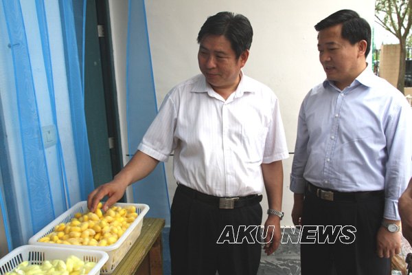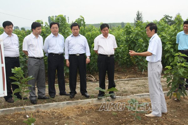 在我院蚕桑科研基地,杨希文、方玮峰参观了桑树资源保护区和野生蚕资源基因库,听取了科研基地负责人的汇报,并详细询问了解了研究经费的来源、科研成果的示范推广等相关问题。在得知目前蚕桑科研基地已经在全市8个县建立了10个示范点后,杨希文厅长称赞学院做了一件很有意义的事,应该继续坚持,同时希望学院在蚕桑学科专业建设方面有所突破。方玮峰市长希望能够进一步加快研究步伐,加大成果示范推广范围和产业化步伐,以推动安康蚕桑产业发展,让更多的群众受益。
