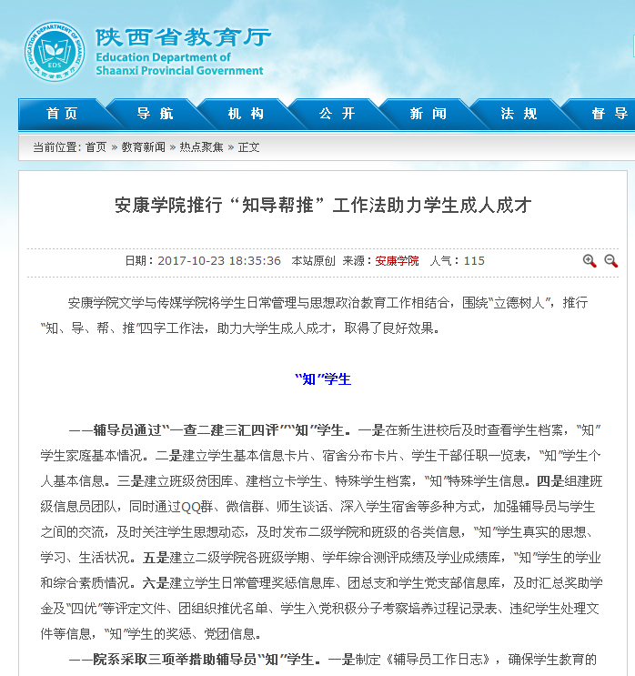 10月23日,陕西省教育厅“热点聚焦”栏目发布了以《安康学院推行“知导帮推”工作法助力学生成人成才》为题的一篇文章。文章介绍了我校文传学院将学生日常管理与思想政治教育工作相结合,围绕“立德树人”,推行“知、导、帮、推”四字工作法,助力大学生成人成才的工作经验。