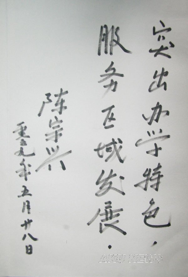 陈主席认真听取了汇报,对学院升本以来的各项工作给予了肯定,他要求学院借安康突破发展的东风,抢抓机遇,乘势而上,加快学院发展,办好人民满意大学。会谈结束时,陈主席欣然提笔,为我院作了“突出办学特色,服务区域发展”的题词,并请学院领导代他向全院师生问好。