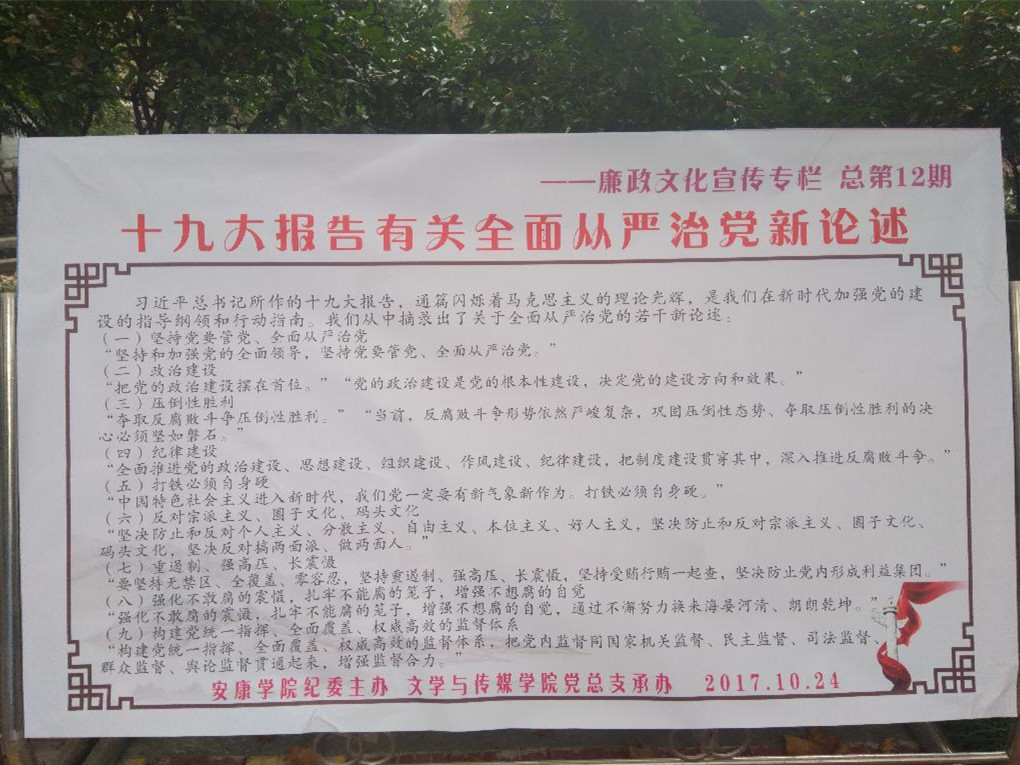 ——纪委(监察处)。自10月18日至30日,持续转载《人民日报》、新华社刊登的关于十九大报道和相关文件20余篇,以便全体师生员工认真学习、深入领会十九大精神实质。10月24日,主办“廉政文化宣传专栏第12期(十九大专辑)——重读传统文化经典,培育清正育人环境”。