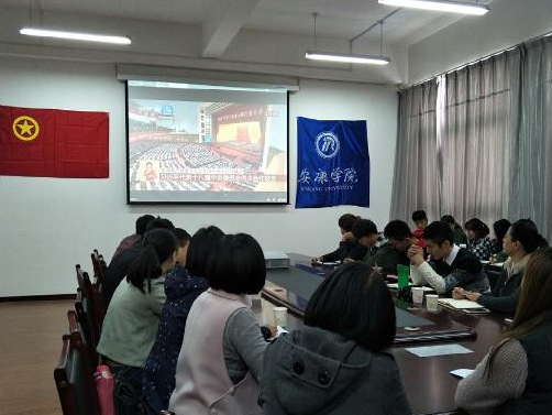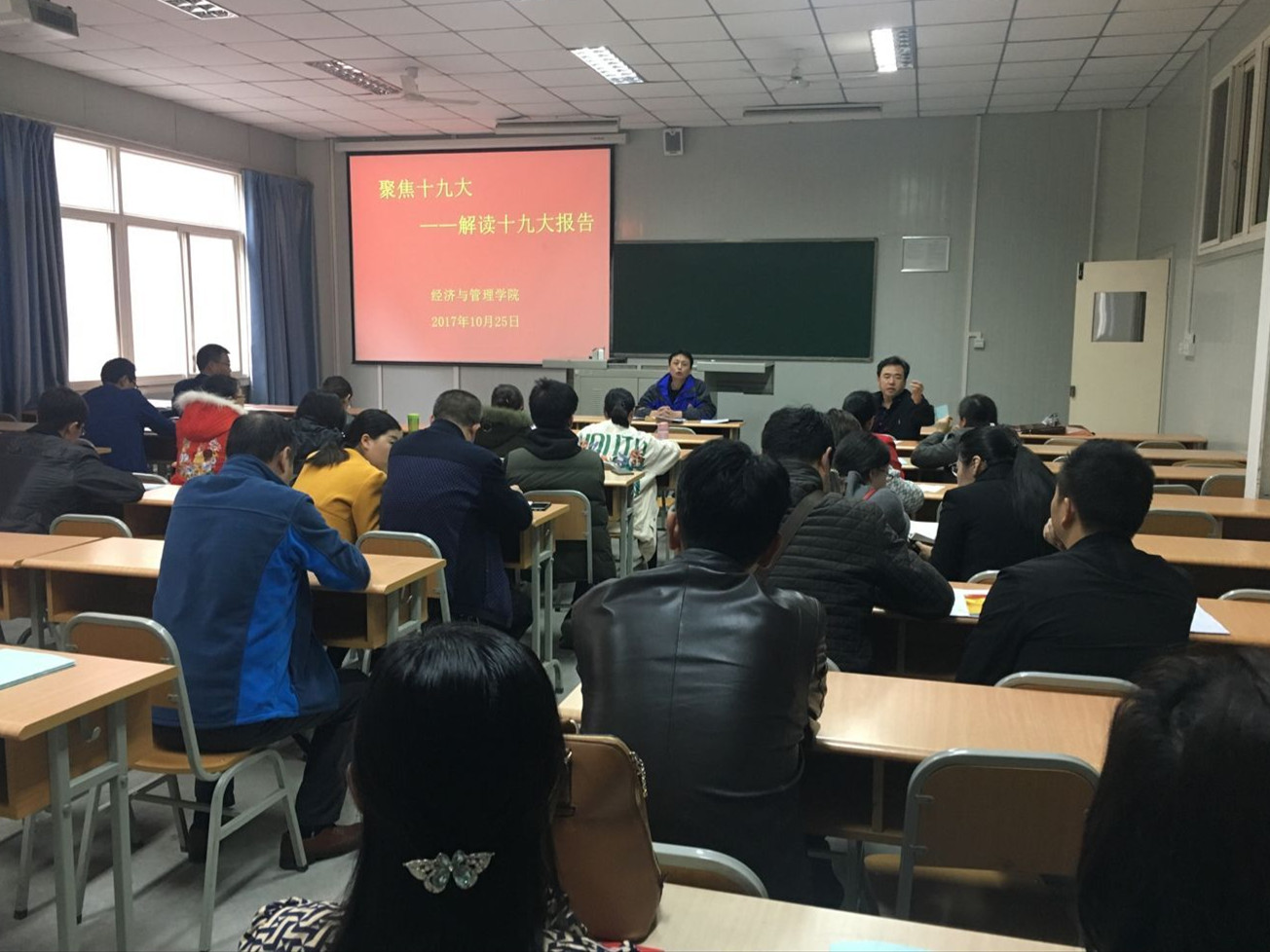 ——经管学院。10月18日上午9时,经管学院组织召集无课师生在江北校区餐厅二楼集体收看了十九大开幕式盛况。收看结束后,师生纷纷表示,习近平总书记的报告思想丰富深邃、内涵博大精深,规划了未来的愿景,描绘了未来的蓝图,令人振奋和鼓舞。我们将把思想和行动统一到十九大精神上来,在具体工作、学习中不忘初心,牢记使命,砥砺前行。10月25日下午,学院党总支在江南校区1021教室召开“聚焦十九大——解读十九大报告”专题学习会议。会议由党总支书记郑武生主持。会上,郑武生讲道,习近平总书记所作的报告气势恢宏、继往开来,是马克思主义的纲领性文献,是我们党面向未来的伟大政治宣言;报告坚持以人民为中心的发展思想,言简意赅,都是关系党和国家前途命运的关键话、都是指导工作实践的管用话、都是接地气听得懂的大实话,饱含深意,极具感染力和震撼力;报告描绘了中国未来的宏伟蓝图,使我们看到了中国未来的愿景,令人振奋、备受鼓舞。学习宣传贯彻十九大精神是当前和今后一个时期的首要政治任务,我们要在全院掀起学习宣传的热潮,把思想和行动统一到十九大精神上来。郑武生对学院今后一段时期深入学习宣传贯彻党的十九大精神进行了安排。一是中心组、党总支、党支部、团总支要带头先学,并要迅速组织支部党员、团员青年、师生员工认真学习和深入领会十九大精神实质;二是11月上旬召开中心组学习十九大精神心得体会交流会,11月30日以前,全体党员每人提交一篇1000字以上的心得体会文章;三是将学习十九大精神与提升教育教学质量、人才培养质量紧密结合,与推进学院各项工作紧密结合,与实现我校十三五两大战略任务(转型发展、提升层次)紧密结合,自觉用党的理论创新成果武装头脑、指导实践、推动工作,不断谱写我校各项事业新篇章。10月26日中午,经管学院学生第一党支部书记石晓琳在江北校区1423教室为本支部全体学生党员讲授了“不忘初心,牢记使命”学习党的十九大精神专题党课。石晓琳讲道,十九大报告紧紧围绕中华民族伟大复兴的中国梦这个宏伟目标,顺应时代潮流,回应人民向往,发出了新时代的政治宣言。作为马克思主义中国化最新成果,习近平新时代中国特色社会主义思想是实现社会主义现代化和中华民族伟大复兴中国梦的行动指南。她激励学生党员:第二个百年的奋斗目标需要你们去实现,作为新时代青年学子中的先进代表,一定要不忘初心,牢记使命,努力学习,练就本领,使自己成为德智体美全面发展的社会主义事业合格建设者和可靠接班人,中华民族伟大复兴的中国梦终将在一代代青年的接力奋斗中变为现实,希望大家在实现中华民族伟大复兴历程中建功立业,担负当代青年人的重大历史使命。党课结束后,举行了新党员入党宣誓仪式。11月1日中午,学院团总支在江北校区1421教室召开十九大精神学习会,团总支委员、各班团支部书记参加学习。会议由团总支书记段雪丰主持,郑武生参加学习并对团总支、团支部下一步的深入学习宣传贯彻十九大精神提出要求。 下午,党总支中心组在党员活动室召开了学习十九大精神心得体会交流会。与会的每位同志结合自己的学习情况和实际工作,分享了学习收获,交流了学习体会,表示要继续深入学习领悟十九大精神,把思想和行动统一到十九大精神上来,自觉用党的理论创新成果武装头脑、指导实际工作。