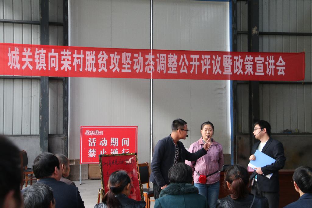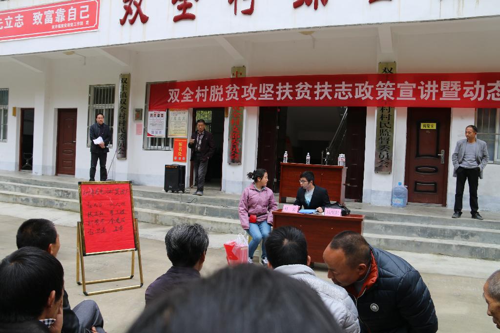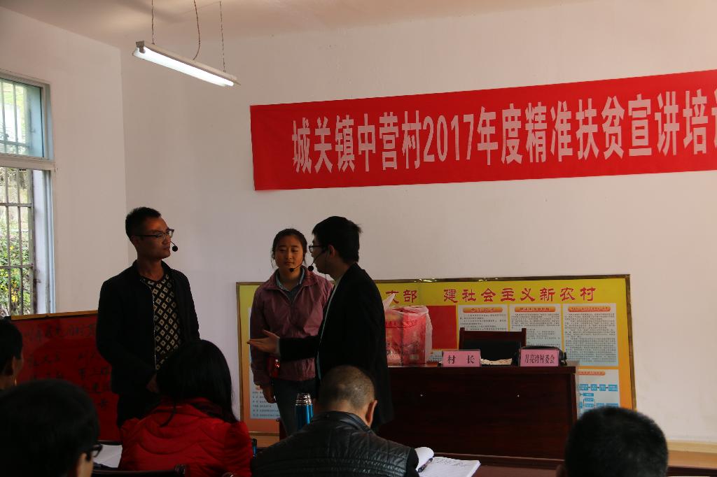 政治与社会发展学院学生张岳、周伟、晏小雪、周凌玉4名同学向4镇6村的群众表演了我校自编自演的小品——《扶贫路上》,小品反映了月亮湾大学生村官在精准识别扶贫户时发生的一系列故事,村民李小菊女儿大学毕后取掉了贫困户,想给村民委员会主任送酒想补上贫困户,爱打麻将单身大龄青年李铁树提着麻将问村民委员会主任,30岁单身为何评不上贫困户,作品生动刻画了当前农村扶贫工作中的现实问题,向群众宣传了党和政府的扶贫方针与政策,对与会的群众起到了积极的教育作用。