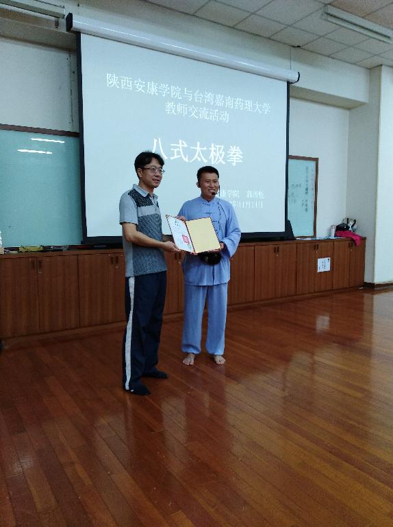 11月14日,在台湾嘉南药理大学研修的安康学院青年教师郭西魁应邀为该校教师社群开展了一次“八式太极拳”的授课活动。