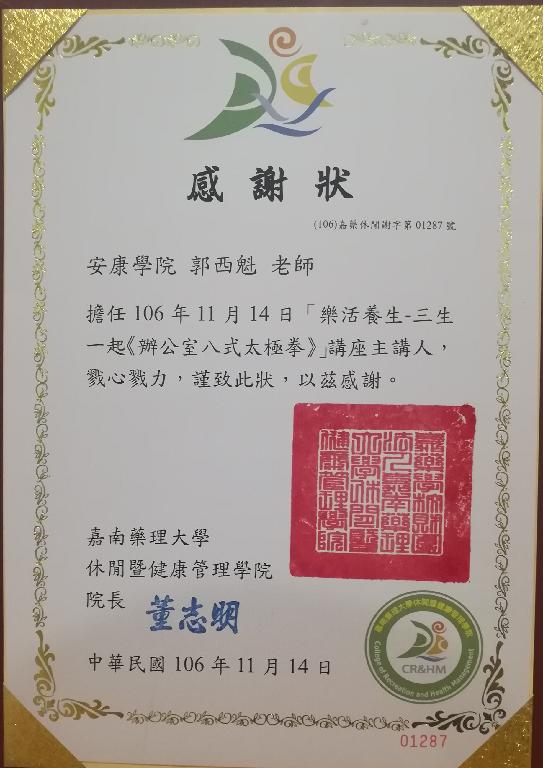 授课活动分为太极拳文化与理论、八式太极拳技术指导和太极拳术展示三个部分。郭西魁深入浅出、形神兼备地现场展示了太极拳文化的魅力,并完整地传授了一套适合老师们在办公室习练的“八式太极拳”,让初学者在短短的2个小时之内就掌握了简化的太极套路。在美妙悠扬的太极音乐伴奏下,他和我校赴台湾嘉南药理大学访学的周琼、陈佳两位老师共同展示了“24式太极拳”和“42式太极拳”,赢得了现场老师们的阵阵掌声。台湾嘉南药理大学休闲暨健康管理学院院长董志明博士为郭西魁颁发了感谢状。