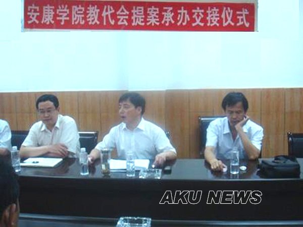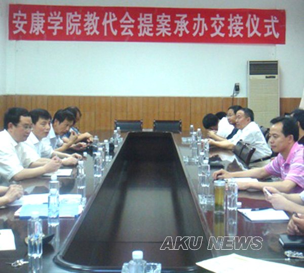 6月19日下午2:30时,安康学院一届四次教代会提案承办接交仪式在东校区大会议室举行,学院党委副书记、工会主席胡鸿晓,学院副院长向纪明,工会专职副主席苏汉青,工会副主席赵临龙,出席接交仪式。苏汉青主持了交接仪式。教代会提案代表、提案承办部门领导、提案工作小组成员参加了会议。