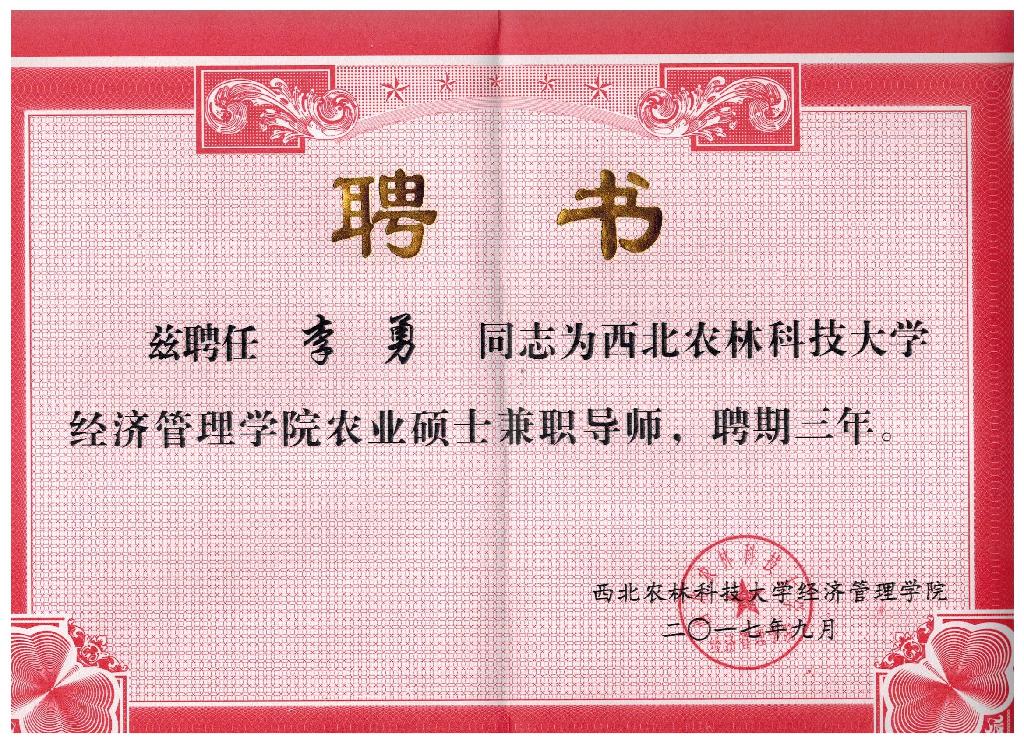 11月27日,西北农林科技大学举行了联合培养研究生导师聘任仪式,我校经济与管理学院副院长李勇教授,李丽教授、陈绪敖副教授被西北农林科技大学经管学院聘为兼职硕士研究生导师。