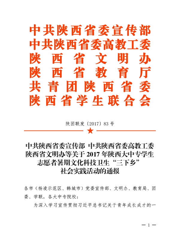 附件:《关于2017年陕西大中专学生志愿者暑期文化科技卫生“三下乡”社会实践活动的通报》(陕团联发〔2017〕83号)