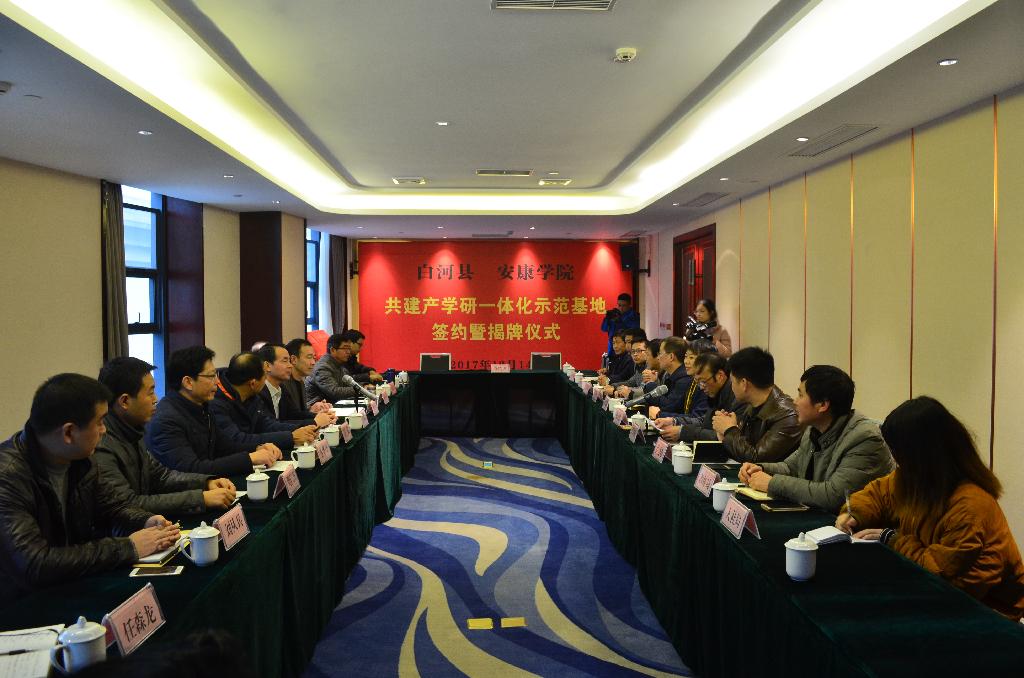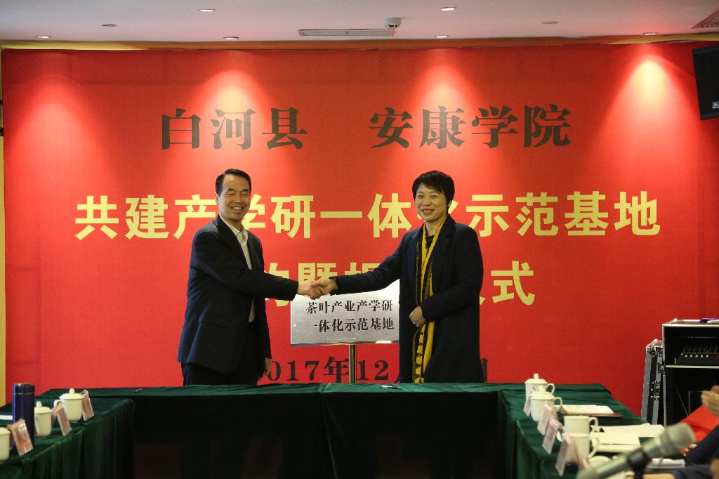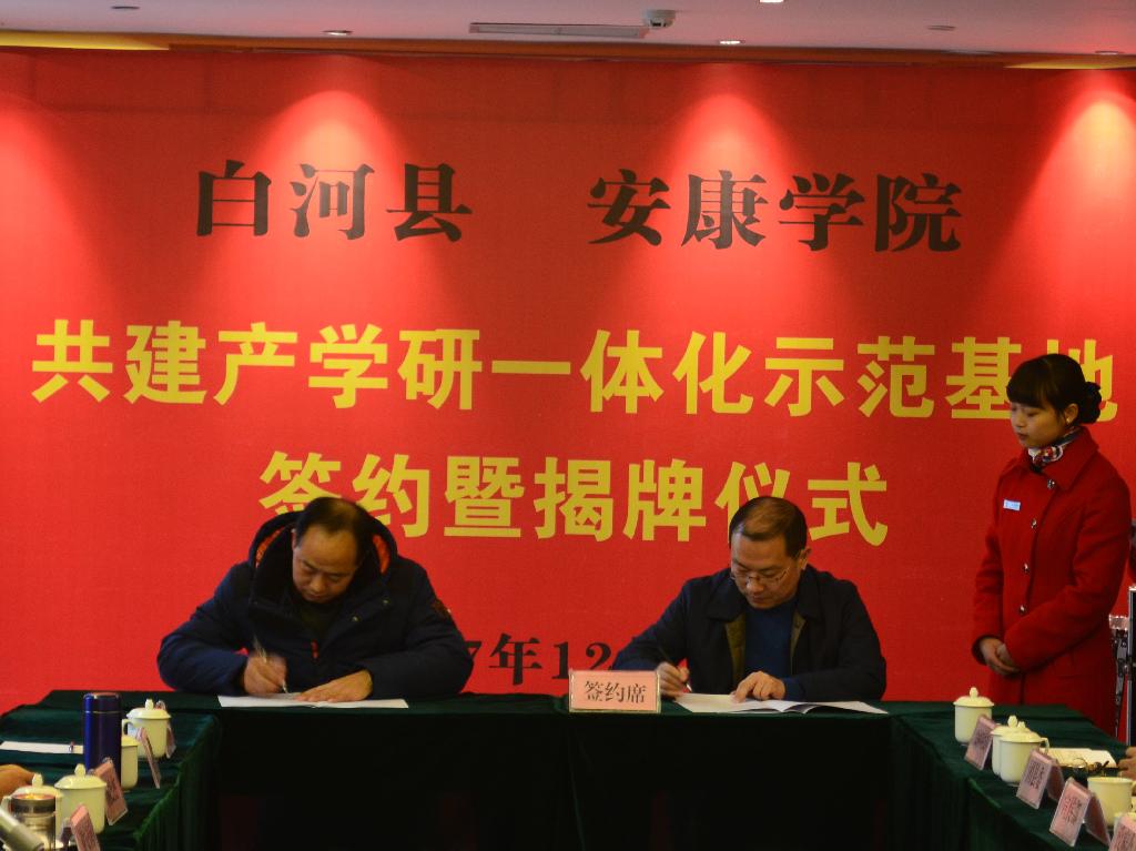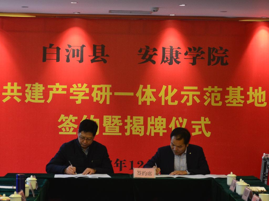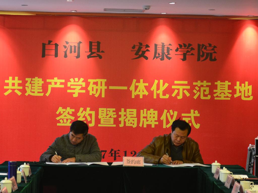 12月14日,我校与白河县人民政府共建产学研一体化示范基地签约暨揭牌仪式在白河县隆重举行。安康学院党委书记王国良,党委副书记、纪委书记闵小平;白河县县委常委、组织部部长张吉彩,扶贫办主任吕志群,白河县紫熙农产品开发有限公司负责人雷银礼、白河县歌风春燕茶业有限公司负责人黄从高等出席仪式。王国良为示范基地揭牌,闵小平为揭牌仪式致辞。仪式由白河县农林科技局局长史建强主持。