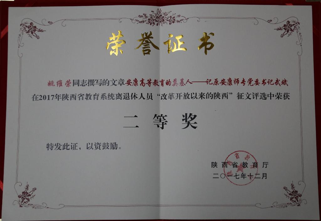 12月22日,省教育厅召开全省教育系统老干部工作优秀调研成果暨离退休人员优秀征文表彰大会。我校离退休工作处撰写的《支持老有所为,提升精神生活质量》调研报告荣获“陕西省教育系统老干部工作调研成果三等奖”;离退休教师姚维荣教授撰写的《安康高等教育奠基人——记原安康师专党委书记武斌》文章荣获“陕西省教育系统离退休人员‘改革开放以来的陕西’征文评选二等奖”。