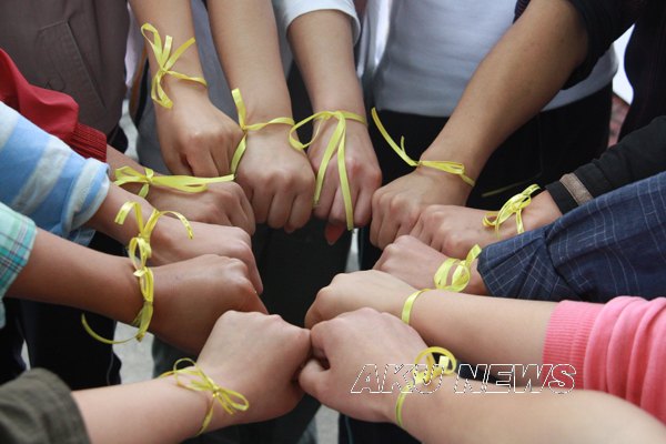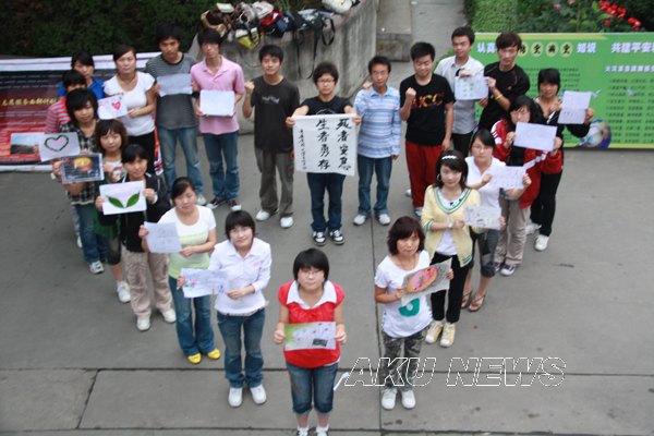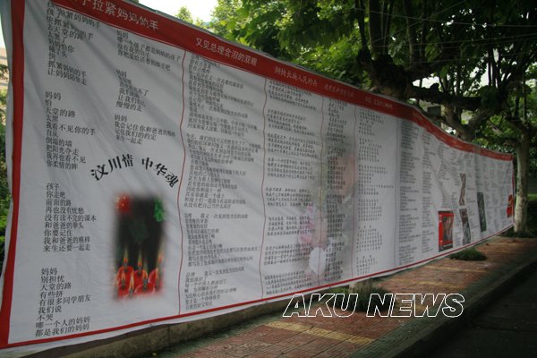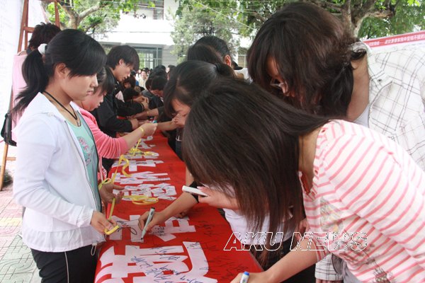 从5月12日早上起,由我院学生自发编辑的短信――“那一刻,我分明看见你哭了。5.12地震一周年,国人的哀思在心中流转,灾区人民需要我们支持。安康学院举行“黄丝带”签名送祝福活动,希望每一个收到短信的人都去参加,送去自己的祝福!”便在师生的手机上传播。12点下课后,大家自觉地来到了签名现场,默默地签下了自己的名字,系上黄丝带,为汶川祈福,为中国祈福。学院的外籍教师也来到现场,送上对灾区的祝福。 “黄丝带”在校园内穿梭,传递着希望,涌动着祝福。以“汶川情 中华魂”为题的诗歌条幅,吸引着众多师生驻足诵读,再次感受在灾难面前中华民族的不屈精神。